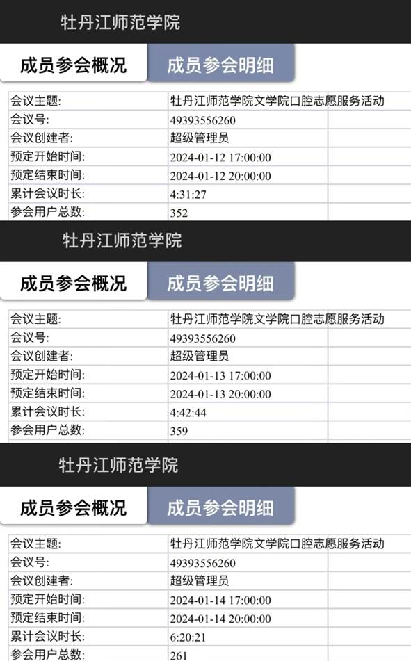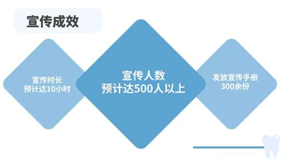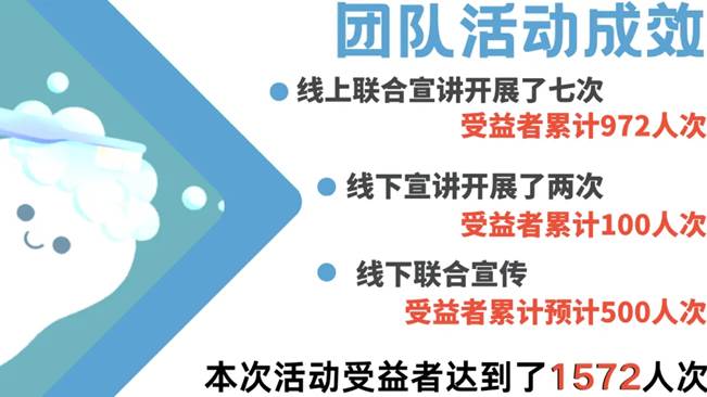 此次活动线上联合宣讲开展了七次,受益者累计972人次;线下宣讲开展了两次,受益者累积100人;线下联合宣传受益者预计达到500人。本次活动受益者累计达到了1572人。服务对象包括保安大叔、超市售货员、居民、大学生、高中生、初中生等,其中95%的人表示对口腔健康有了更深入的了解。通过非遗文化的展示,成功激发了大家对传统文化的兴趣和尊重。即使是线上讲座,同学们也积极活跃,纷纷发送弹幕互动,气氛热烈,参与度较高,达到了我们预期的宣传效果。