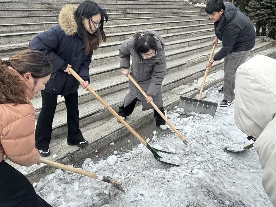 2月26日下午,一场“破冰行动”拉开了劳动实践序幕。面对文科楼北面路上的积雪,文苑连心志愿服务队的志愿者们闻令而动,铁锹破冰除险,扫帚清道排障,经过两个小时的鏖战,最终为师生开辟出了“平安通道”。这场特殊的劳动课堂中,冻僵的手指与滚烫的青春在寒风中交响,诠释着劳动最光荣的真谛。
