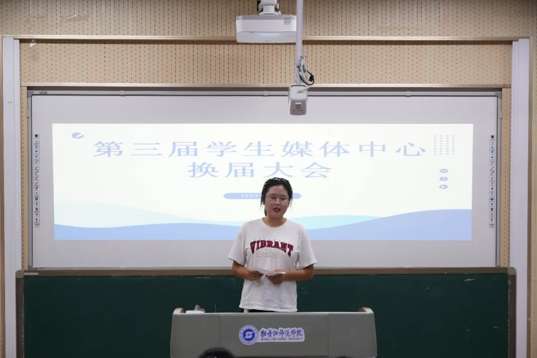会议第一项议程,主任程龄萱作年度工作报告。她总结过去一年里学生媒体中心开展的相关工作,对老师们在工作中的指导与包容表示感谢,也对各位干事的工作成果表示肯定,同时希望新一届成员能够继续立足本职岗位完成各项任务。