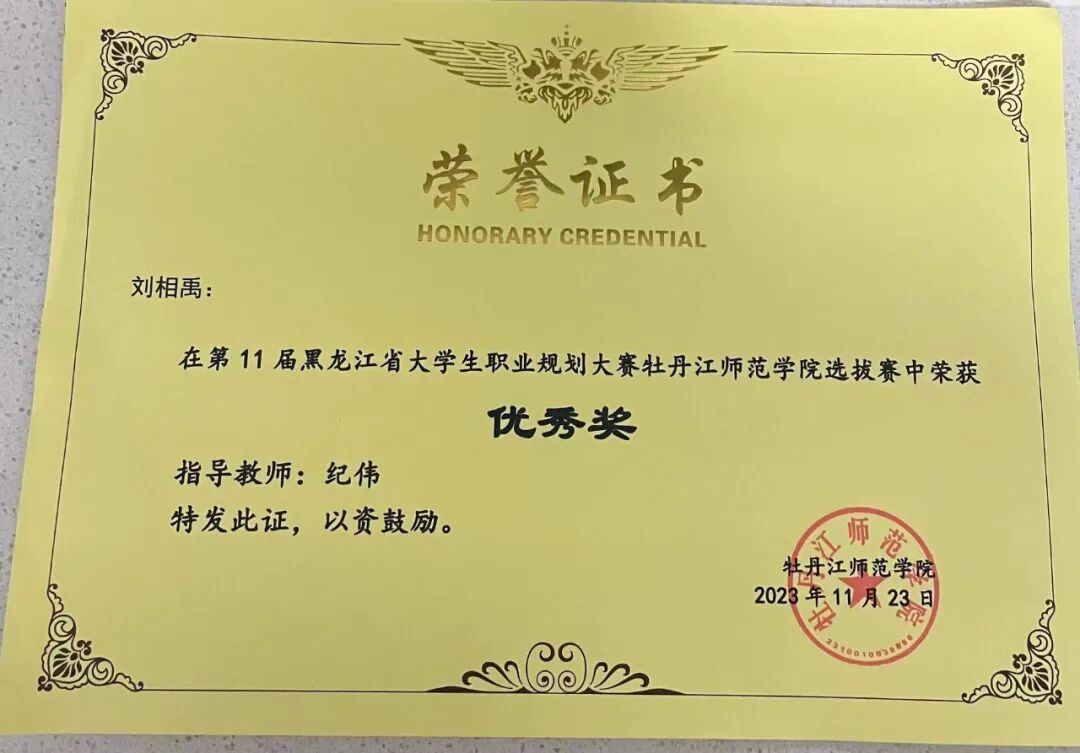2021年,我加入了牡丹江师范学院乃寅写作班,参加微言文化沙龙、读书会、空山诗会等讲座,不断提升文学素养、开拓自己的视野。2023年暑期我以线上腾讯会议方式参加了黑龙江省文学院第二十三届中青年作家班培训,在各位作家的教导中加强理论学习、不断收获新的知识。同时,我积极参加学校组织的活动和学科竞赛,荣获了中国校园文学举办的“书香·青春”首届全国大学生读书征文大赛荣获优秀奖,全国大学生英语竞赛C类三等奖、牡丹江师范学院第七届语言文字大赛优秀奖。我也意识到对自身职业做出规划的重要性,在2023年第十一届黑龙江省大学生职业规划大赛校级选拔赛中荣获优秀奖。