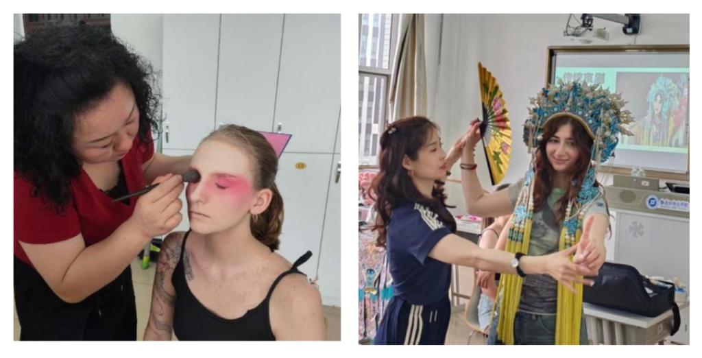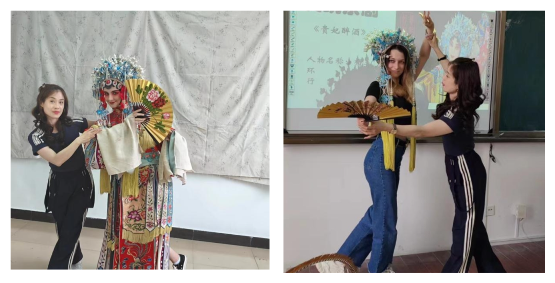 老师们还分别为留学生代表玉沙和卡佳画了贵妃醉酒中杨贵妃和穆桂英挂帅中穆桂英的妆容,穿戴上了杨贵妃和穆桂英的服饰,进行了沉浸式的体验。