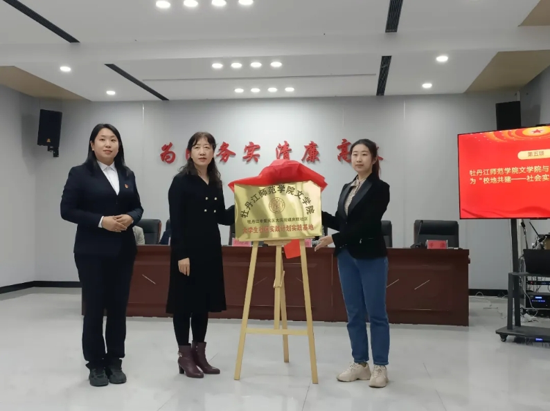 爱民区团委副书记陈秋颖、爱民区庆旺社区党委书记于洁与文学院党委书记刘晓霞共同为校地共建社会实践基地揭牌。