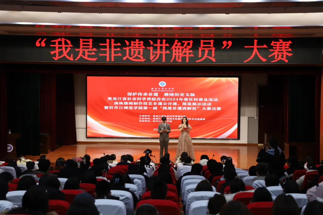 为贯彻落实党的二十届三中全会和黑龙江省哲学社会科学工作推进会精神,加强高校社科普及能力建设,增强大学生社科普及的责任意识与非遗保护传承能力,12月10日,黑龙江省社科科学界联合会立项支持的2024年度社科普及活动——“保护传承非遗,赓续历史文脉”:非遗公开课、非遗展览展示活动暨牡丹江师范学院第一届“我是非遗讲解员”大赛决赛在我校春秋讲坛举办,该活动由我校科研处、文学院支持,黑龙江省非物质文化遗产研究学术交流基地主办,文学院党委书记刘晓霞出席本次大赛。省非物质文化遗产研究学术交流基地主任宋娟教授、文学院副院长施新佳、文学院副院长付振华、历史与文化学院教师尹立娜、美术与设计学院教师赵立石担任本次决赛的评审工作。