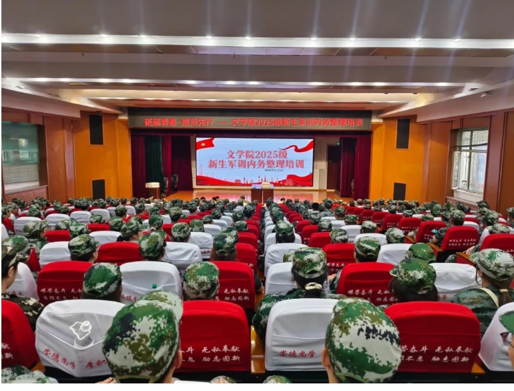 新生们认真观摩、反复练习,在细节修正和互相学习中体会严谨细致的生活作风,展现文学院学子良好的精神面貌和军训纪律性。